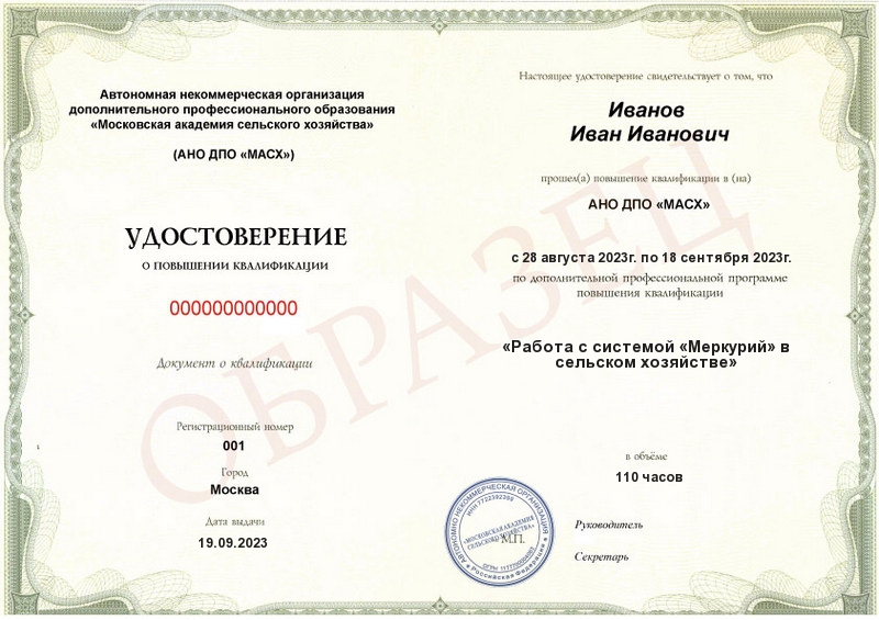 Удостоверение о повышении квалификации Подтверждает ваше обучение по программе «Работа с системой «Меркурий» в сельском хозяйстве».